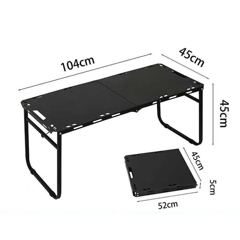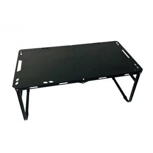 We are a wholesale supplier of outdoor folding tables from China. The unfolded dimensions of our foldable large-sized tactical table are 104 cm × 45 cm × 45 cm. The folding size is 52 cm × 45 cm × 5 cm. It is made entirely of carbon steel. It is composed of thickened table boards. There are laser-cut holes on the side, which can be used to hang and store barbecue tableware racks. The table legs are designed with hydraulic rods and connected to high-quality hardware accessories. Make our foldable large-sized tactical table suitable for various terrains. Additionally, we offer a storage bag as a complimentary gift.